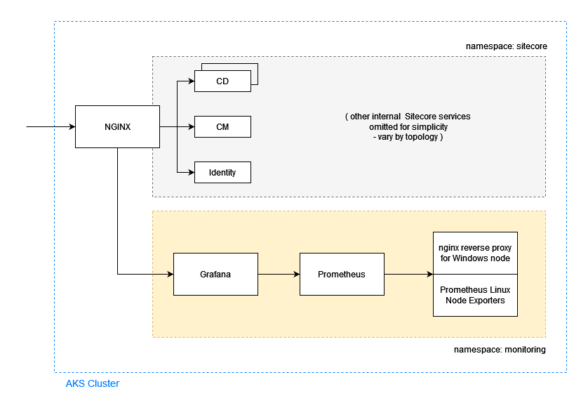 Step 8 – Deploy the nginx reverse proxy service on the monitoring namespace of the AKS cluster, using the Kubernetes specs shared in my MonitoringSitecoreOnAKS repository. Before executing the deployment command, update the image setting defined in the /prometheus-nginx/nginx.yaml file with the name of the image in your container registry that you pushed at Step 7. Then execute from the k8s folder in the local repository the following command in Powershell to deploy the service to the AKS cluster: