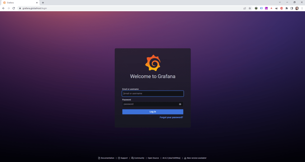 Once Prometheus and Grafana are installed successfully, you will be able to access Grafana in your browser at https://grafana.globalhost/.
