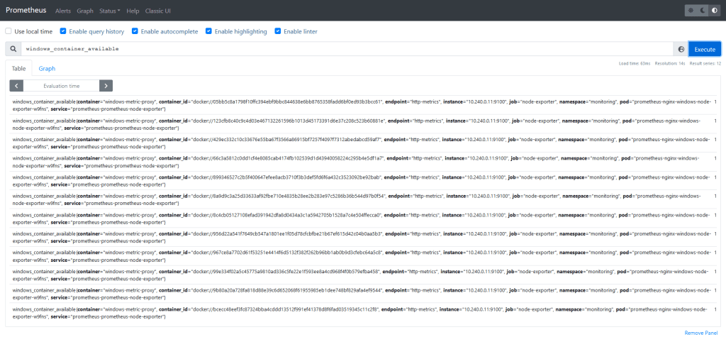 and querying for any Windows metrics (for example: windows_container_available):