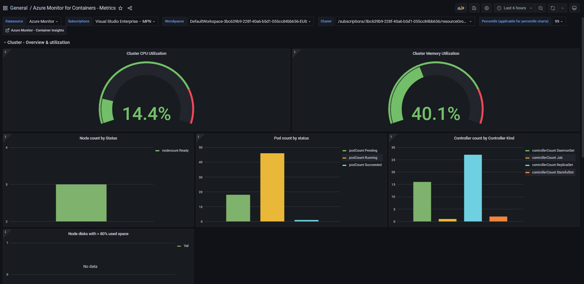 This dashboard displays Azure Container Insights metrics of the AKS cluster (resource utilization at cluster level and namespace level). Its JSON template is based on the original dashboard ID 10956, where I fixed the Cluster ID template variable.