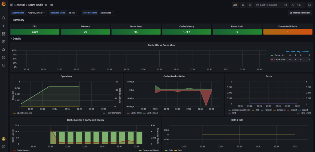 This dashboard displays metrics for an Azure Cache for Redis resource, in terms of CPU, memory, server load, connections, errors, cache hits, operations and many more.