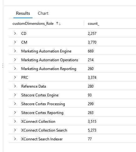 requests | summarize count() by cloud_RoleName traces | summarize count() by tostring(customDimensions.Role) dependencies | summarize count() by cloud_RoleName customEvents | summarize count() by tostring(customDimensions.Role) exceptions | summarize count() by tostring(customDimensions.Role) performanceCounters | summarize count() by tostring(customDimensions.Role)